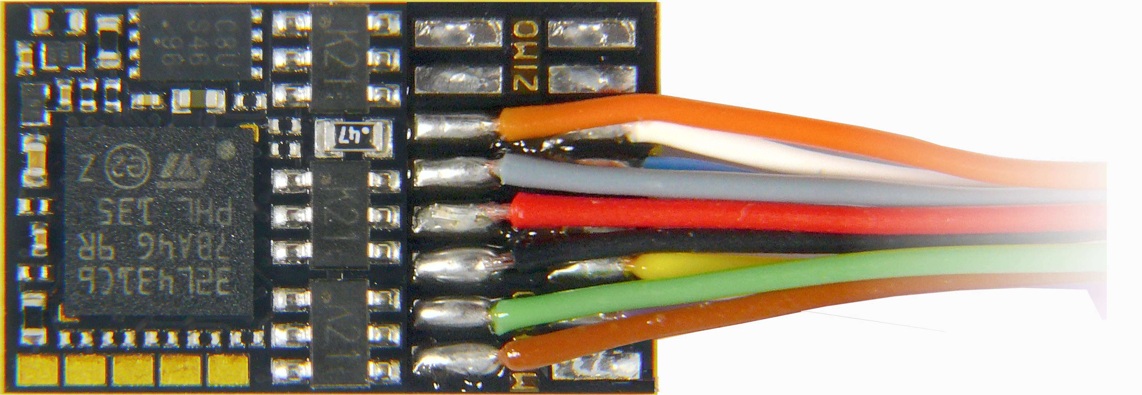 Miniatur-Nicht-Sound-Decoder – 17,6 x 10,5 x 3,1 mm – 1 A – 6 FA - 6-pol Schnittstelle NEM651 an Drähten